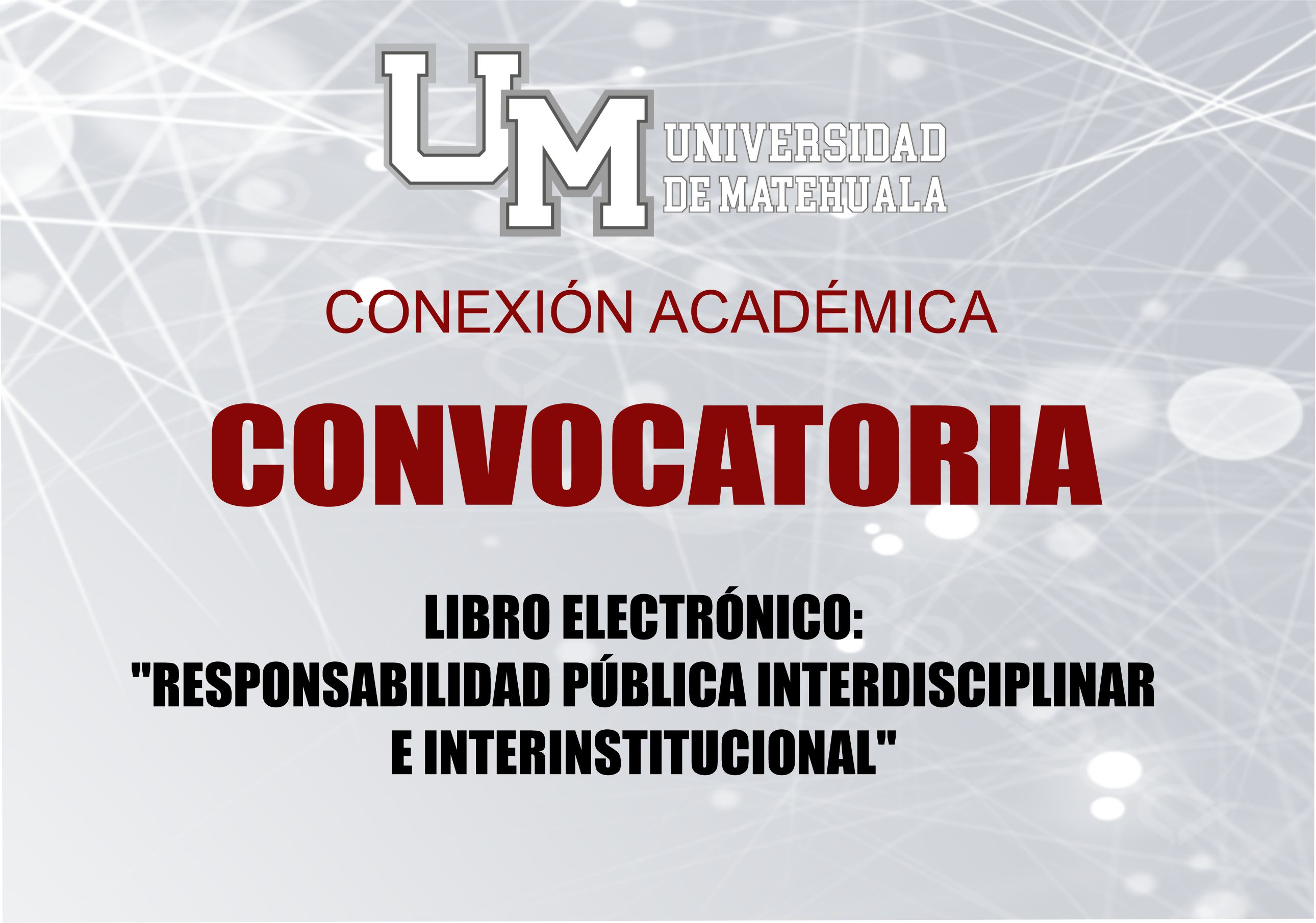 La Universidad de Matehuala y su área de Investigación Conexión Académica convocan a académicos, investigadores y profesionales a presentar trabajos originales y contribuciones para el libro "Responsabilidad Pública Interdisciplinar e Interinstitucional", que tiene como propósito analizar y reflexionar sobre la responsabilidad pública desde una perspectiva interdisciplinar, incorporando enfoques teóricos, prácticos y experiencias colaborativas entre diferentes instituciones.